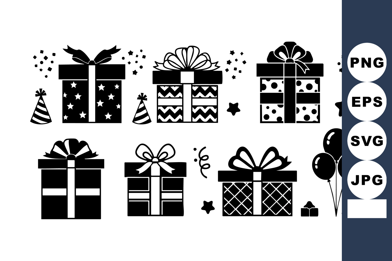 This vector features black silhouette gift boxes decorated with ribbons, stars, balloons, and party hats, perfect for celebration themes. The festive mood is joyful and lively.