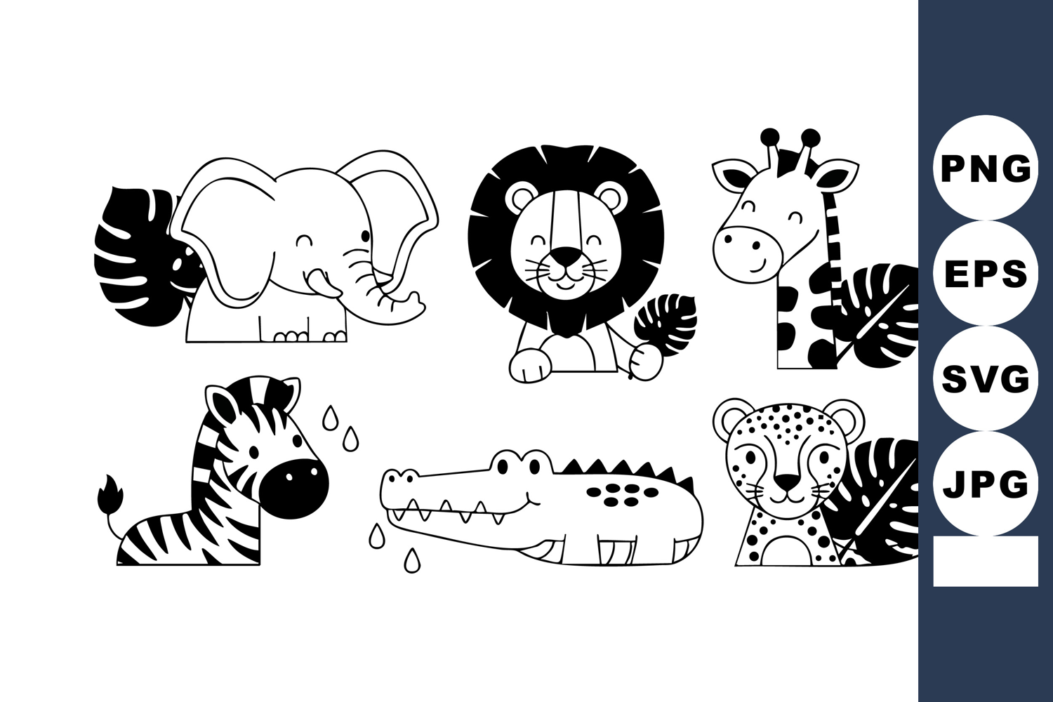 This vector features cute cartoon wild animals such as an elephant, lion, giraffe, zebra, crocodile, and leopard with tropical leaves in black and white style, playful and charming.