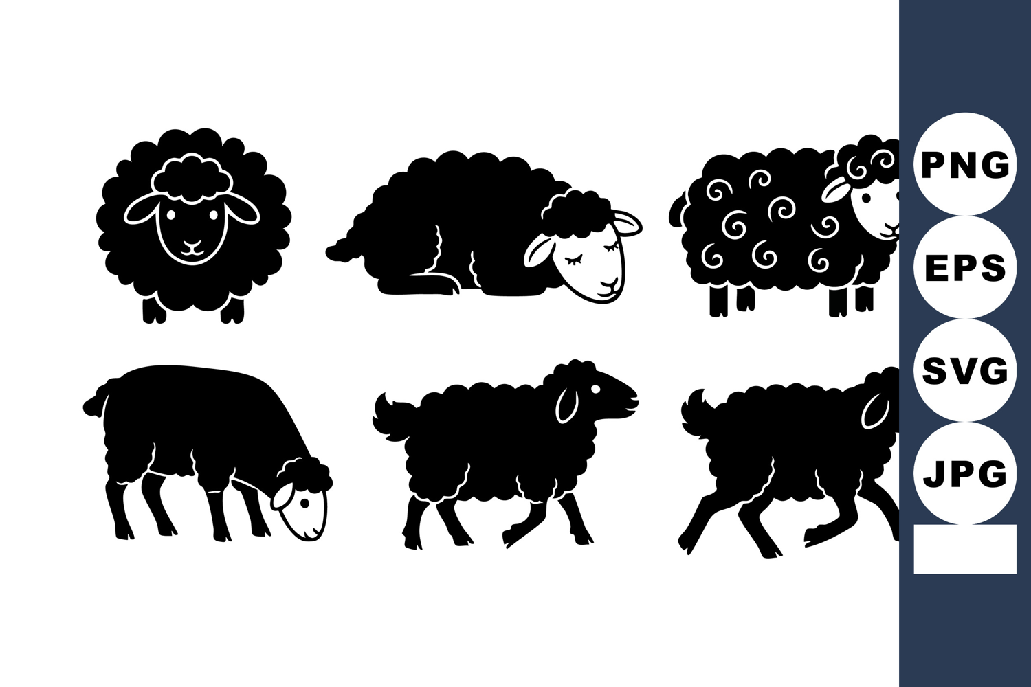 This vector features six black silhouette sheep in varied poses with curly wool, ideal for farm, animal, or nature-themed designs. Simple, clean, and versatile vector art. Calm mood.