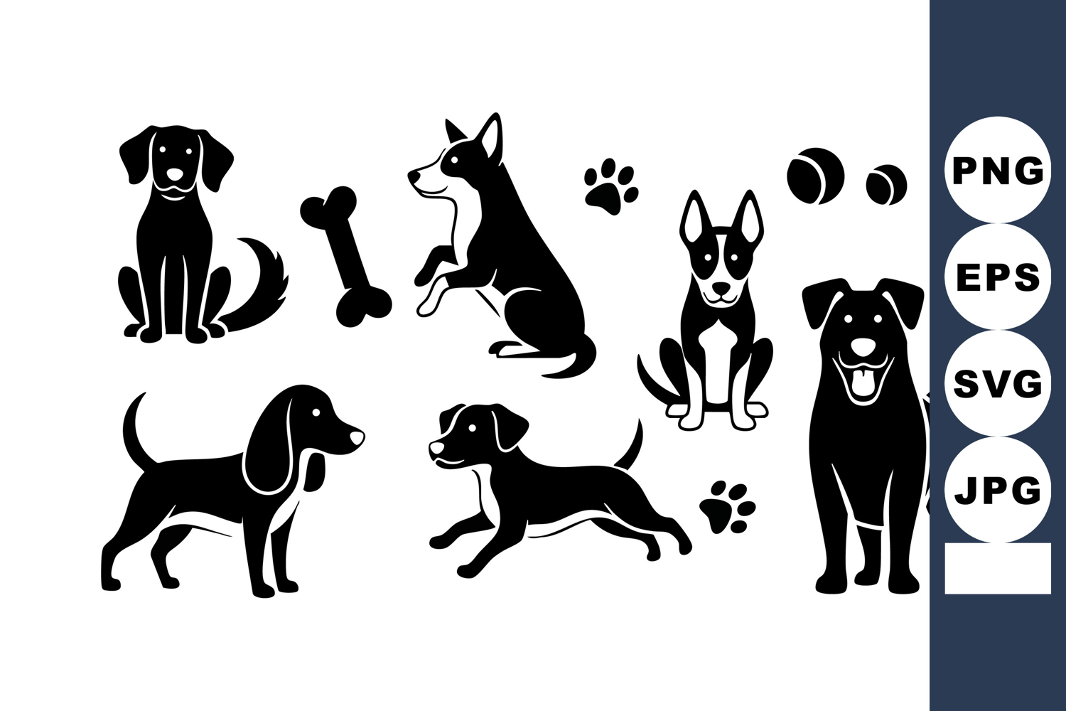 This vector features a variety of dog silhouettes including sitting, standing, and playful poses along with bones, paws, and balls in black and white for a clean, minimalistic look. Cheerful mood.