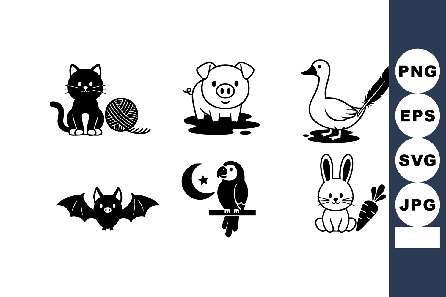 Collection of black silhouette animal icons including cat with yarn, pig, goose, bat, parrot with moon, and rabbit with carrot in vector style. Playful and charming mood.