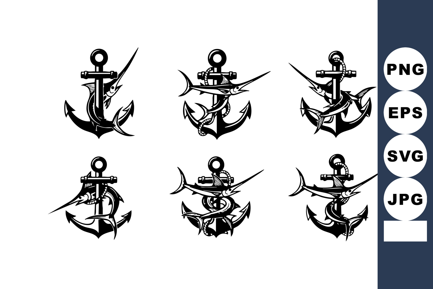 This vector features six nautical anchor icons entwined with ropes and fish, symbolizing maritime themes and sea adventures in a bold black silhouette style. Classic and adventurous.