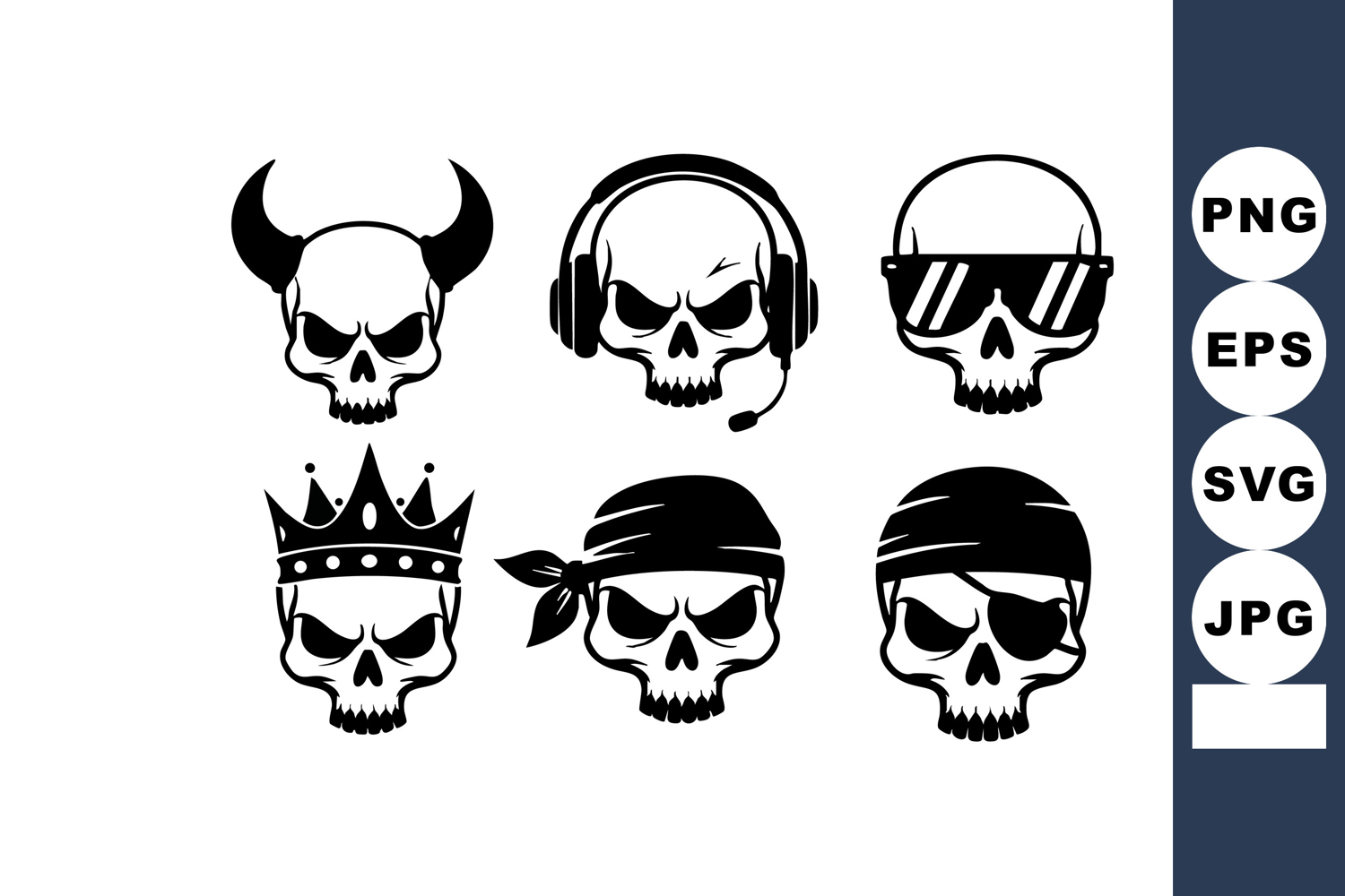 This vector file features six skull icons each wearing different headgear like horns, crown, headphones, sunglasses, and bandanas, presented in a black and white style, striking and bold.
