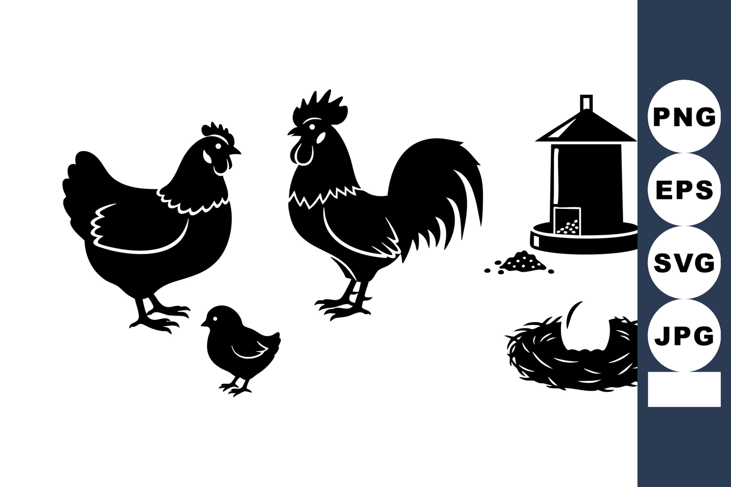 This vector features black silhouettes of a chicken, rooster, hen, chick, nest, and feed silo in simple black and white style, conveying rural farm life in a minimalistic way. Calm.