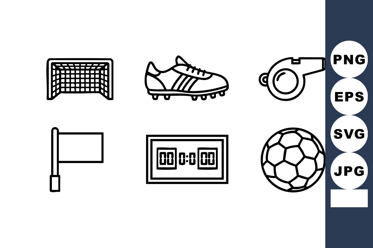 This vector shows soccer equipment icons including a goal net, football boot, whistle, flag, scoreboard, and ball in simple black outlines. Perfect for sports design projects. Energetic mood.