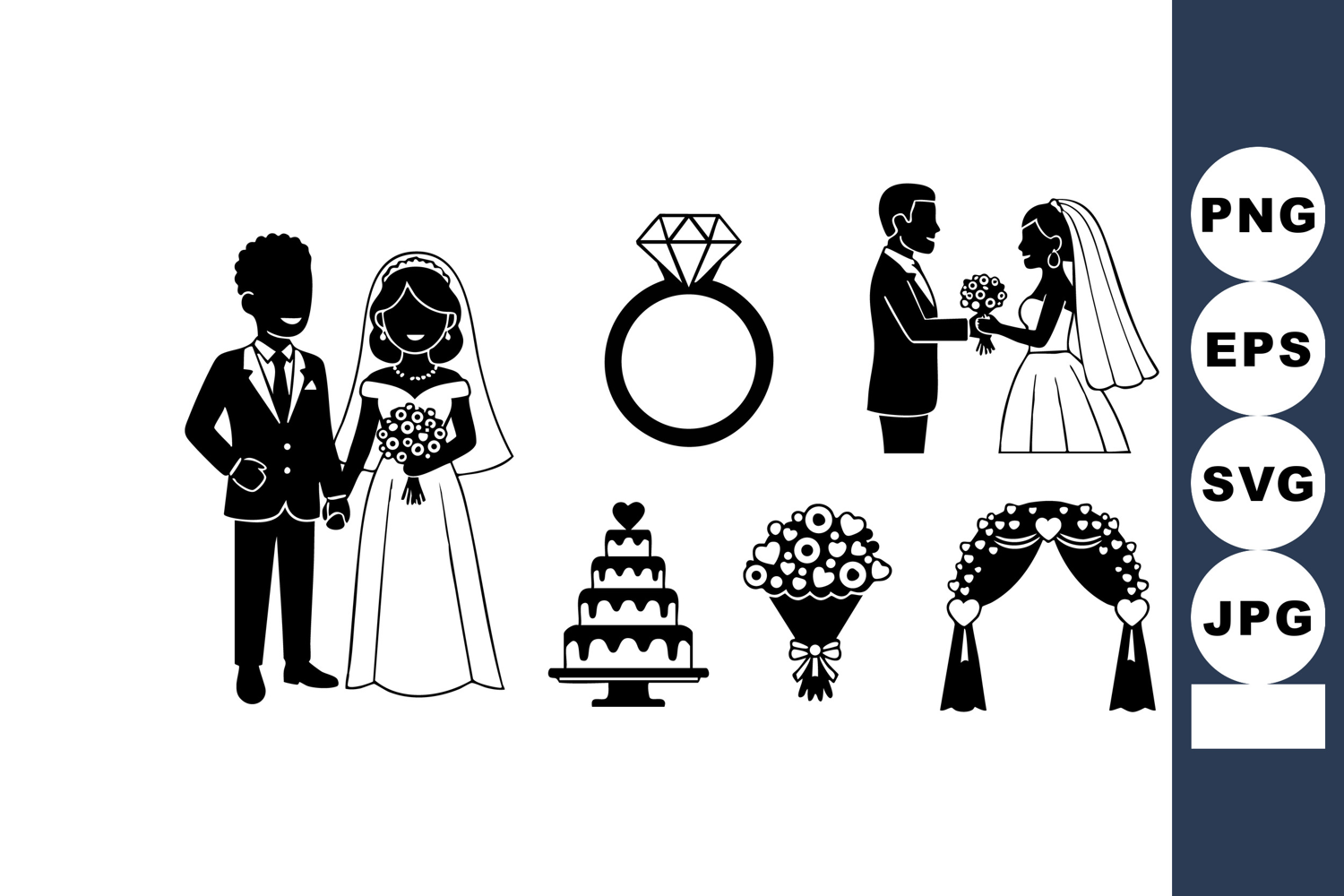 Vector black silhouettes of wedding couple, bride and groom, ring, tiered cake, bouquet, and floral arch. Elegant marriage celebration symbols in simple style. Romantic mood.