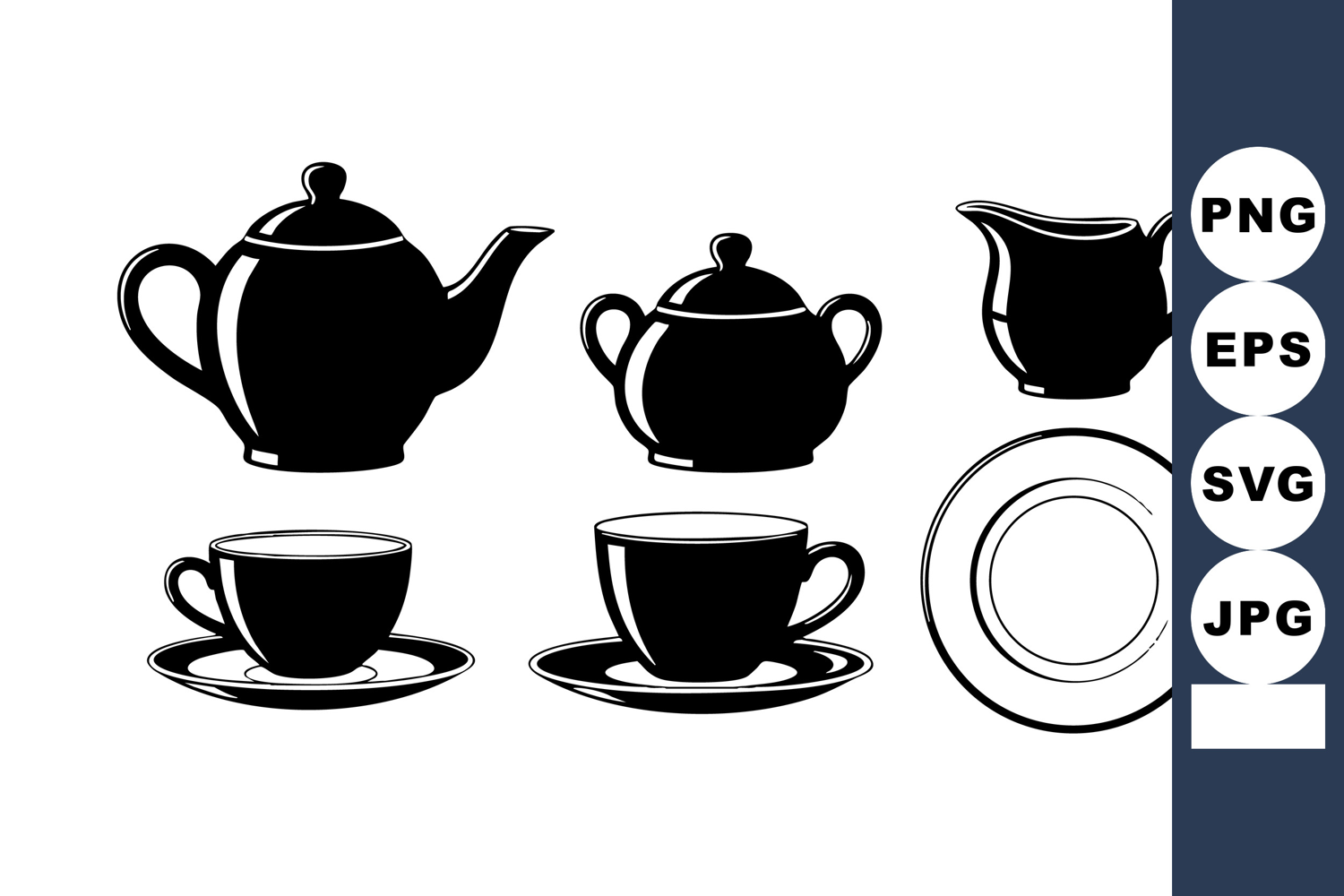 Classic black silhouette tea includes teapot, sugar bowl, creamer, cups, and saucers in vector style. Simple, elegant design with clear shapes. Clean and minimal mood.