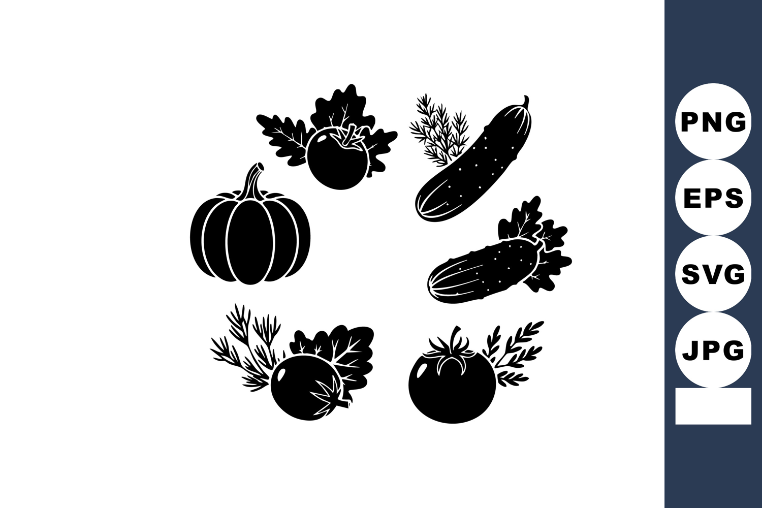 This vector design features black silhouettes of pumpkin, tomato, cucumber, and radish with leaves and stems, representing healthy vegetables and gardening themes in a simple style, calm mood.