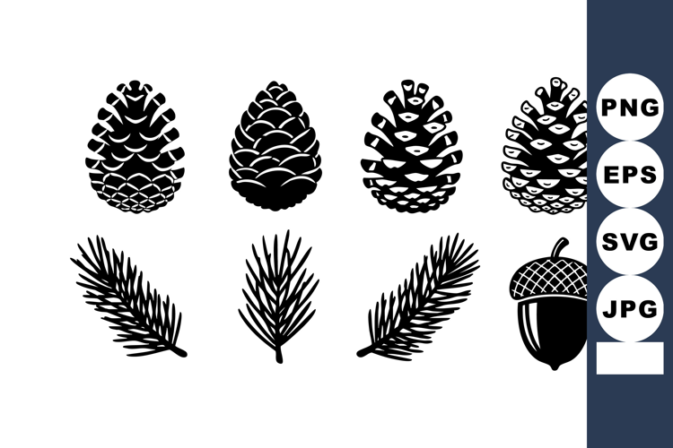 This vector features black silhouette pine cones, fir tree branches, and an acorn arranged neatly for nature-themed design or craft use, conveying simplicity and elegance. Calm mood.