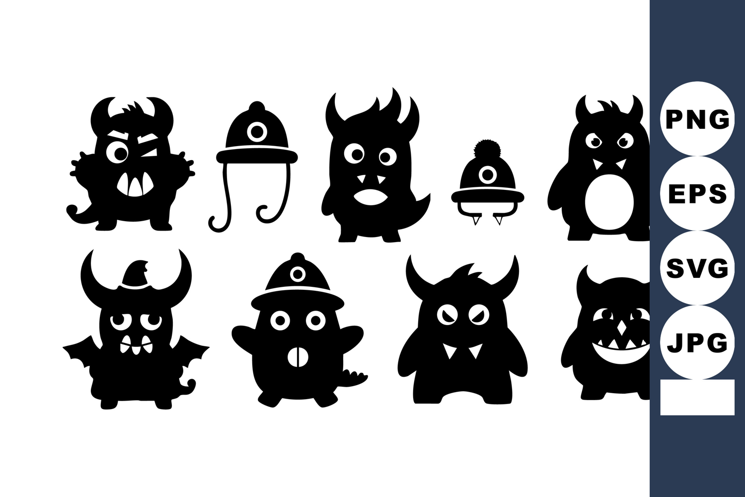This vector shows cute black silhouette monsters with horns and hats in various playful poses and expressions, perfect for fun and creative designs. Cheerful mood.