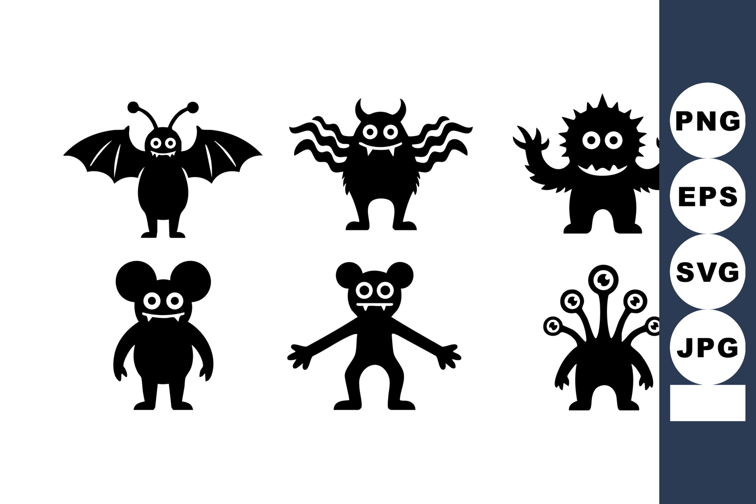 This vector features six cartoon monster silhouettes with various spooky and fun shapes, ideal for Halloween designs and creative projects with a playful mood.