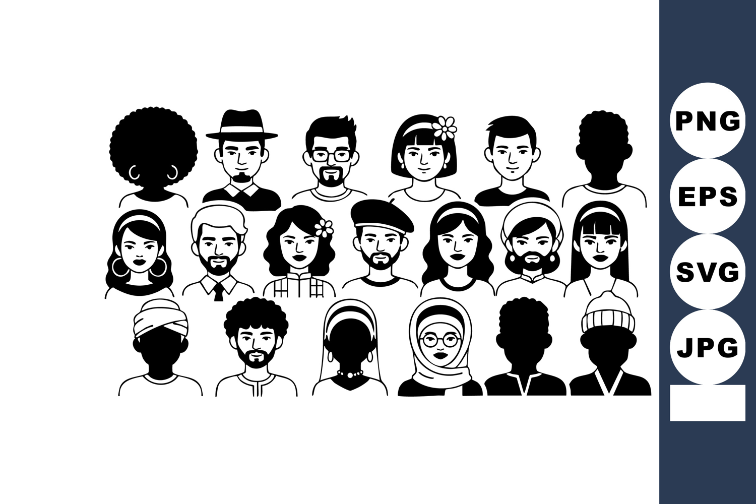Illustration shows diverse multicultural people avatars featuring distinct hairstyles, glasses, hats, and headscarves in black and white, representing inclusion and variety. Friendly atmosphere.