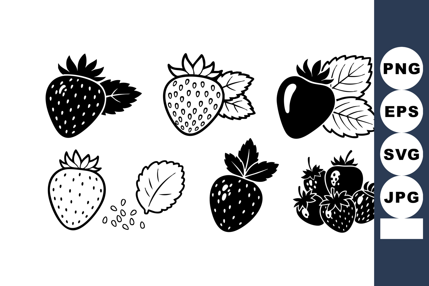 This vector features a variety of strawberry fruit icons with different leaf and seed details in black and white. The design suits decoration and creative projects. Simple and clean style. Cheerful.