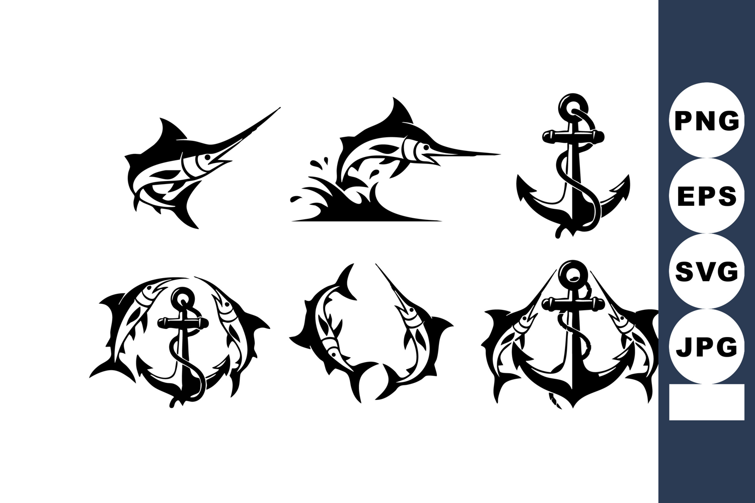 This vector features stylized swordfish and anchors in black silhouette, including fish circles symbolizing unity and strength in nautical design. Perfect for marine-themed creative work. Bold and dynamic.