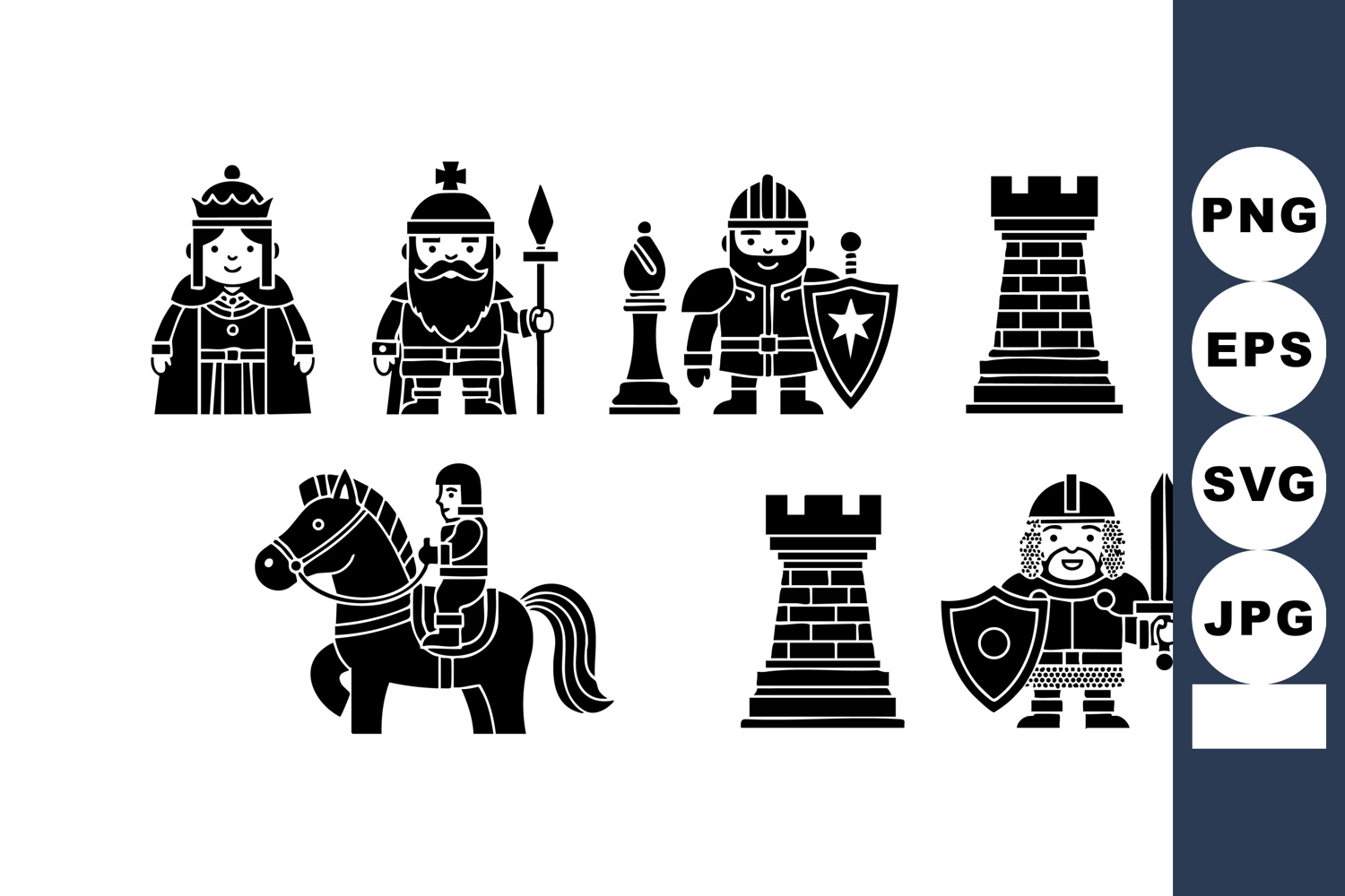 This vector shows medieval chess pieces including king, queen, bishop, knight, rook, and a mounted horse player in black and white. The design is simple and bold, classic style. Elegant.