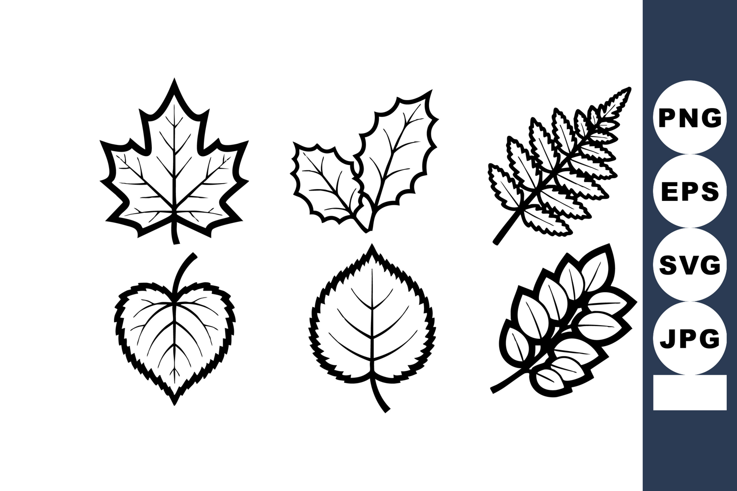 This vector features six distinct black and white leaf outlines including maple, holly, and fern shapes. The simple monochrome style highlights detailed leaf veins, ideal for botanical projects. Calm and natural.