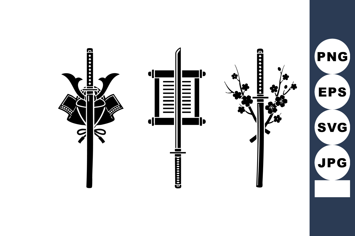 This vector shows three black silhouette designs of Japanese katanas with samurai helmet, scroll, and cherry blossoms, symbolizing traditional culture and elegance. Calm and refined.