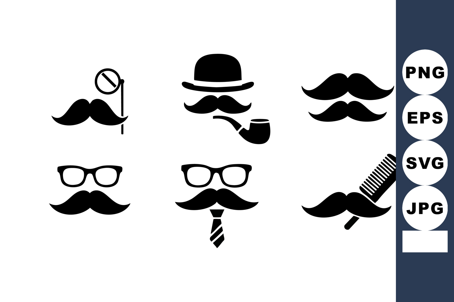 Vector shows men’s accessories including mustaches, glasses, tie, pipe, comb, and monocle in black silhouette style. Classic and stylish icons create a vintage mood.