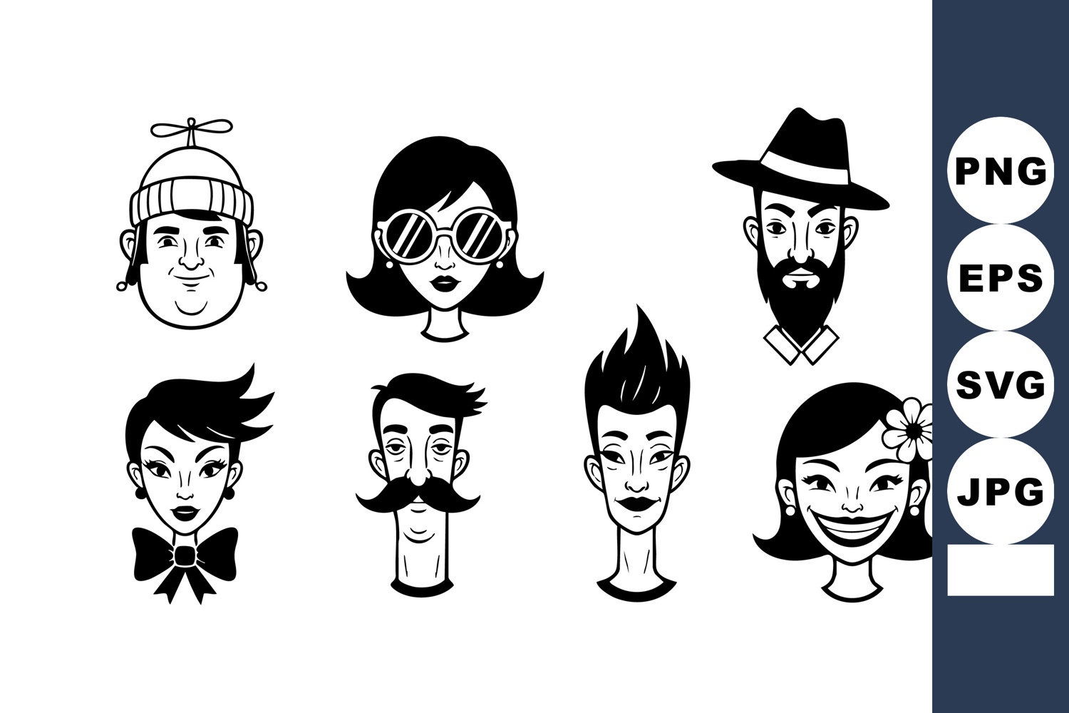 This vector image presents diverse black and white cartoon faces featuring various hairstyles, glasses, hats, and accessories for creative design projects. The style is playful and artistic.