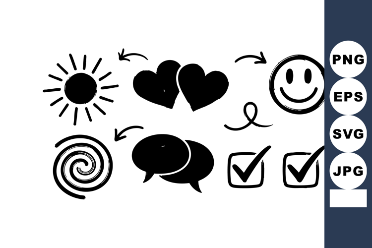 Hand-drawn black icons of sun, hearts, smiley face, spiral, example image 1