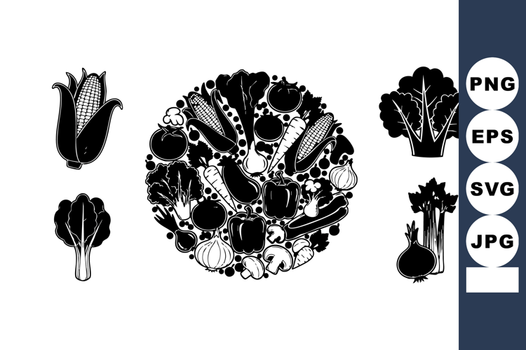 This vector artwork presents a variety of vegetables in black and white, featuring broccoli, corn, and tomato arranged in a circle. It highlights healthy eating concepts with a clean, minimal style. Calm and balanced mood.
