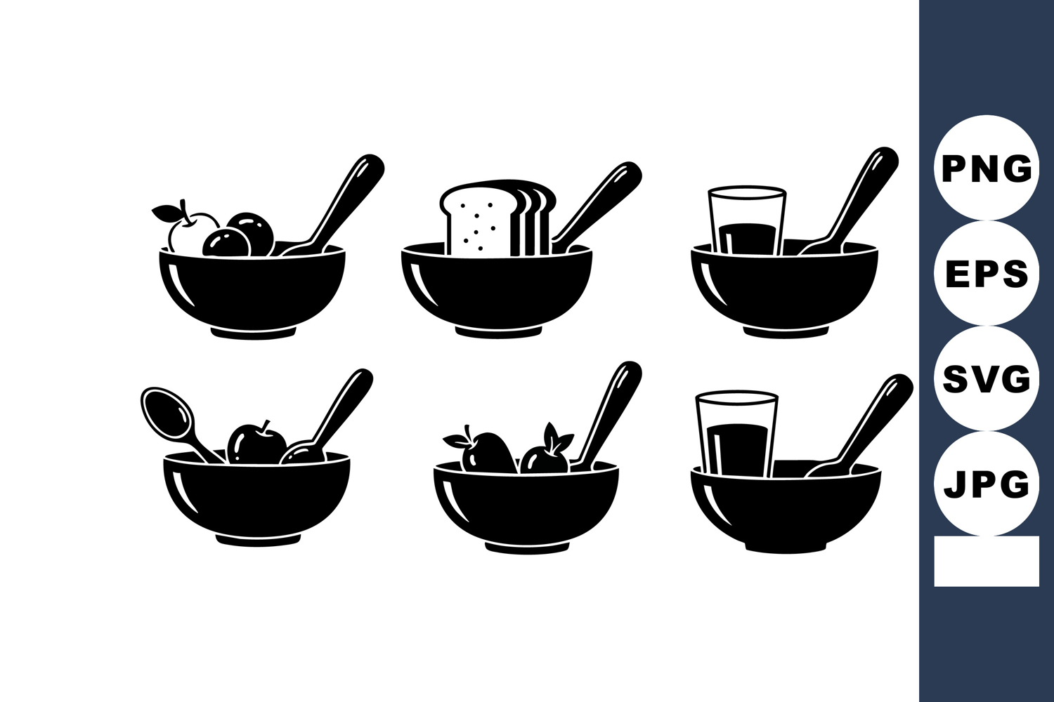 Breakfast food icons with bowl toast juice and spoon in blac example image 1