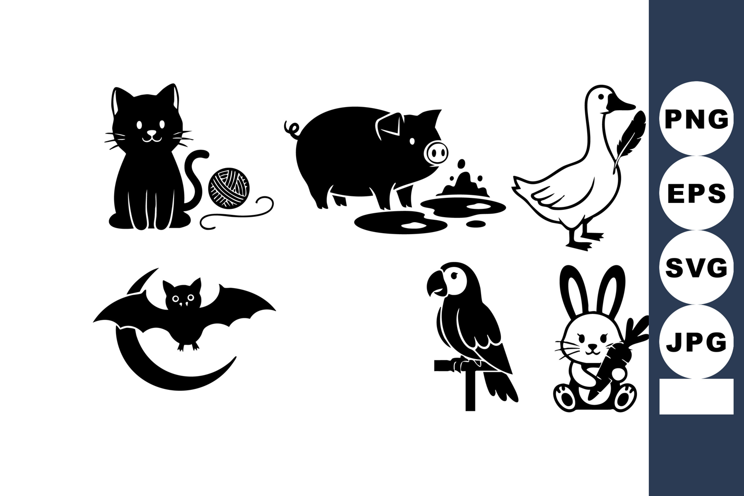 This vector features six black and white animals: cat with yarn, pig, duck, bat, parrot, and rabbit holding a carrot. The design is simple, charming, and playful. Cheerful mood.