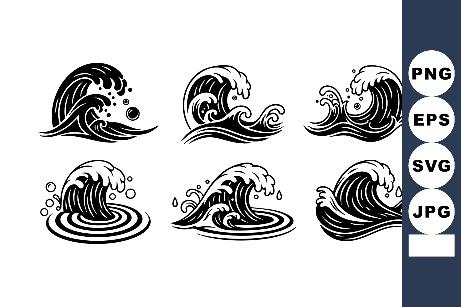 This vector features six stylized ocean wave designs with dynamic water splashes in black and white. Perfect for creative and artistic projects, delivering an energetic and bold mood.