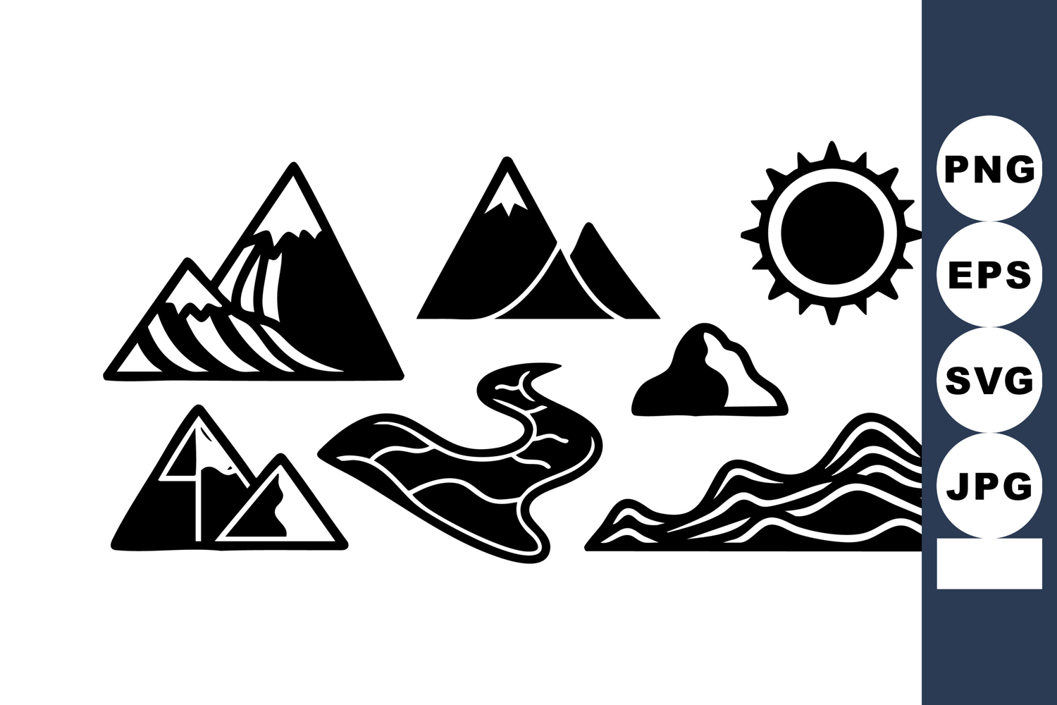 This vector features black mountain peaks, a winding river, sun, and cloud symbols representing natural landscapes and outdoor themes in a simple silhouette style. Calm and minimalistic.