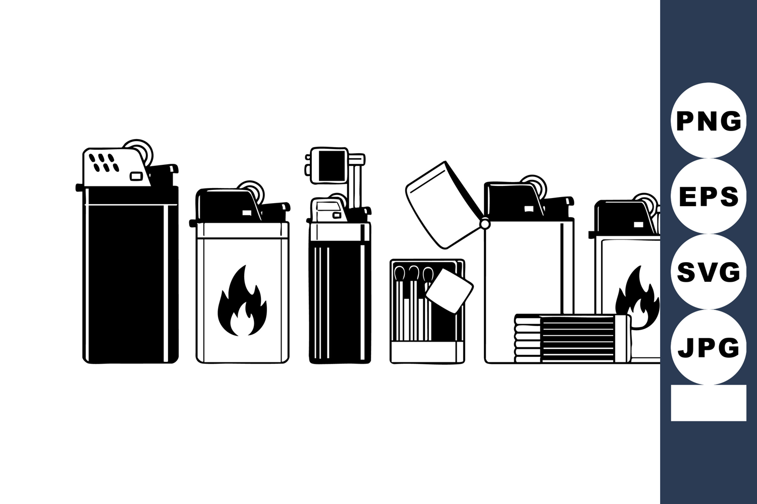 This vector image shows a variety of black and white lighter icons, some with flames and open lids, arranged in a row. The style is simple and clean. Modern mood.