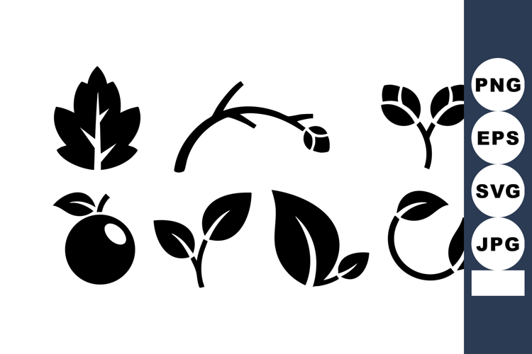 This vector contains minimalistic black icons representing leaves, plants, and fruit, suitable for nature, environment, and botanical design projects. Clean and modern style. Calm.