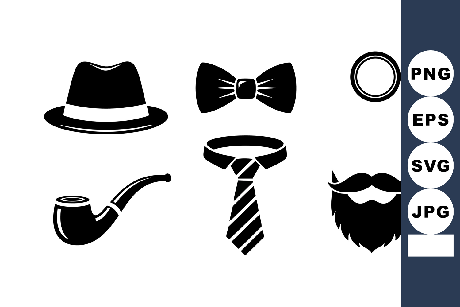 Vector displays classic mens accessories such as fedora hat, bow tie, pipe, necktie, and mustache in black silhouette style, perfect for vintage design projects. Stylish and elegant.