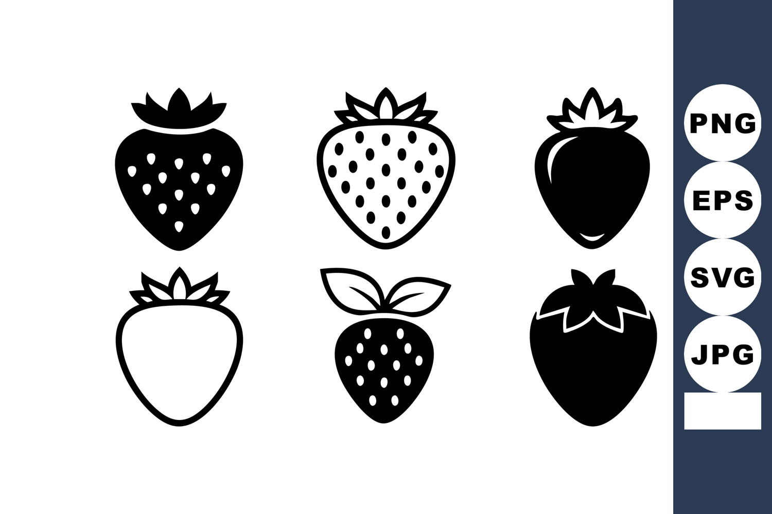 This vector features six strawberry icons in black, white, and outline styles, perfect for fresh fruit and berry design projects. Simple, clean, and versatile illustrations create a modern mood.