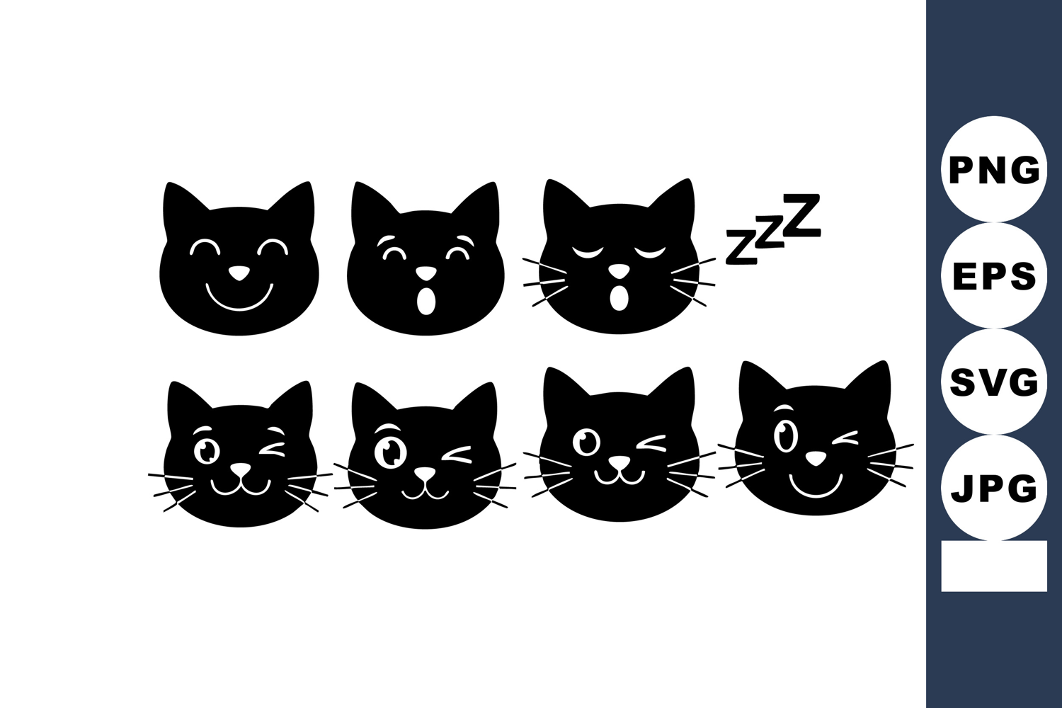 This vector image shows eight black cat faces with various expressions like happy, sleepy, and playful in a simple silhouette style, creating a charming and fun mood.