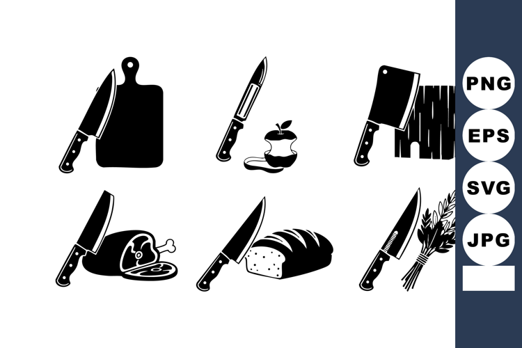 Vector displays kitchen knives with cutting boards holding meat, bread, vegetables, and fruits in black silhouette style, illustrating food preparation tools. Clean and simple design, practical mood.