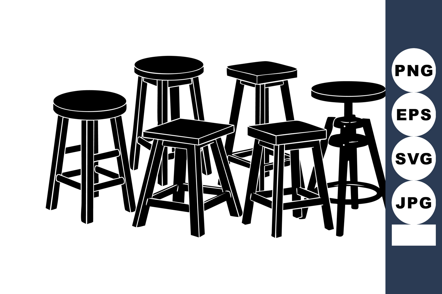 This vector image presents six stools featuring wooden and metal structures with square and round seats in black silhouette style, suitable for design projects, minimalistic and bold. Calm and simple mood.