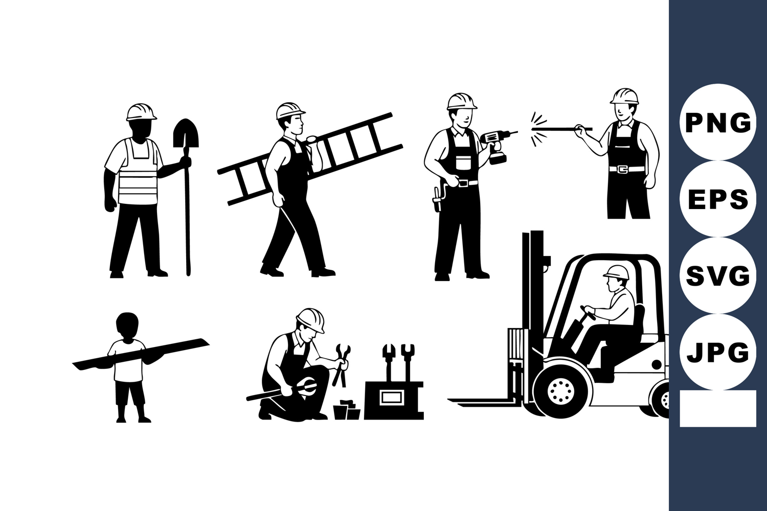 Black and white vector shows construction workers with tools, ladder, and forklift in different poses, depicting industrial teamwork and labor in a clean style. Professional mood.