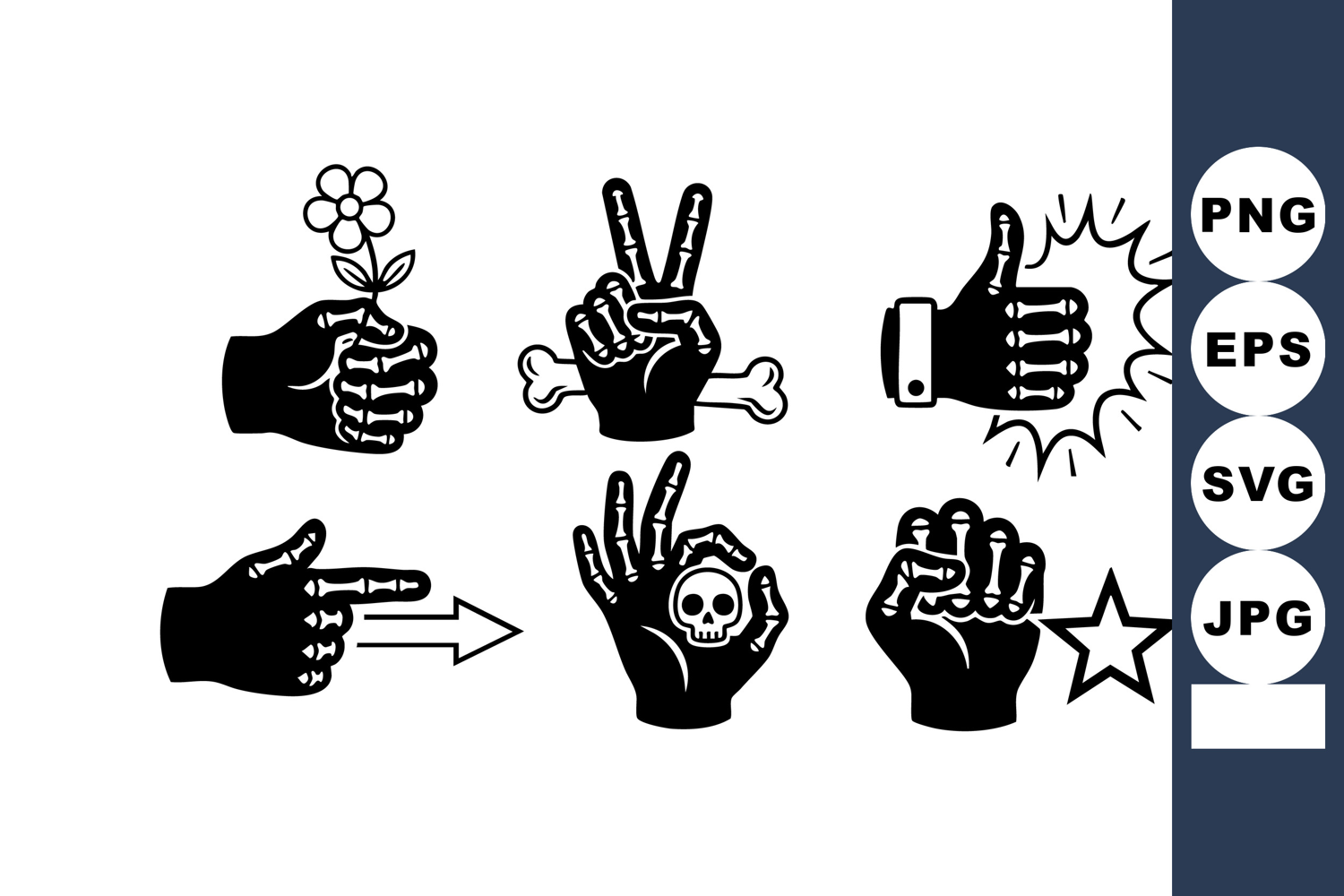 Illustration features six black hand gestures displaying peace, thumbs up, pointing, flower holding, skull sign, and fist with star in bold vector style, conveying symbolic meanings. Energetic mood.