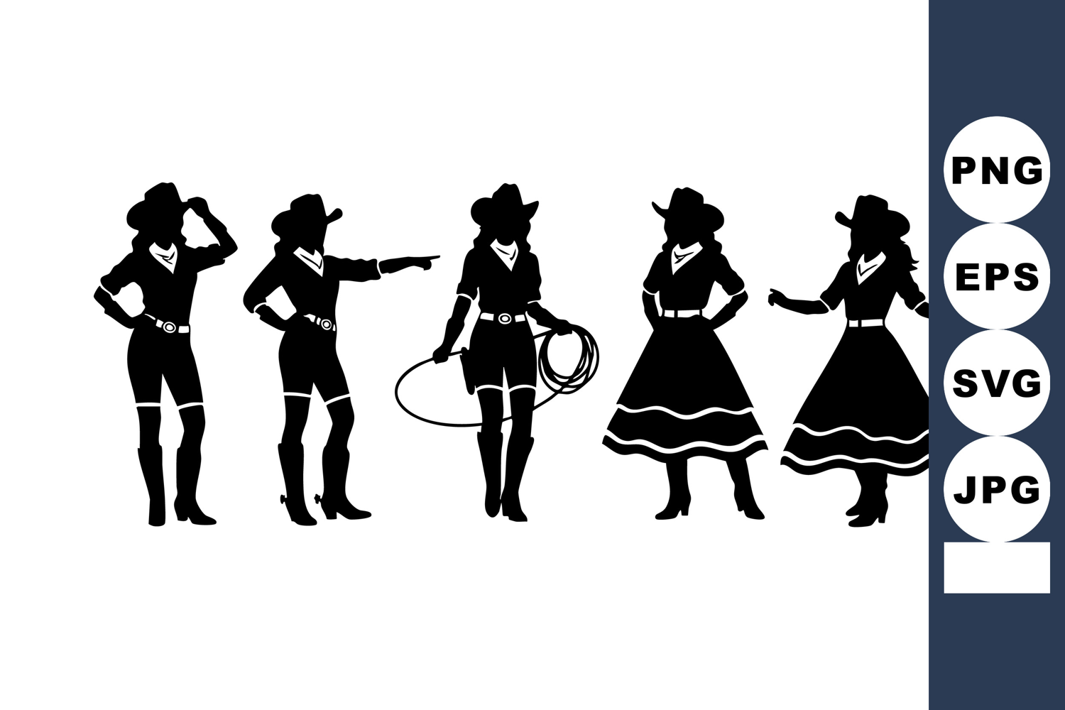 Black silhouettes of cowgirls wearing hats, boots, dresses, and holding a lasso stand in different poses, representing western style with dynamic and bold mood.