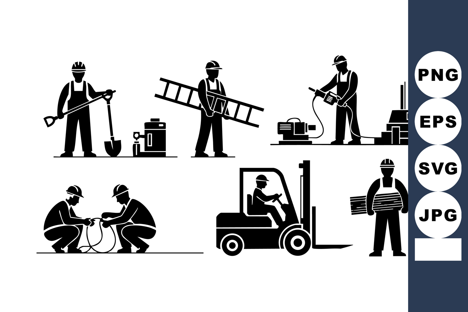 Silhouettes of construction workers performing various tasks including digging, ladder carrying, operating forklift, and handling materials in a dynamic black vector style. Energetic mood.