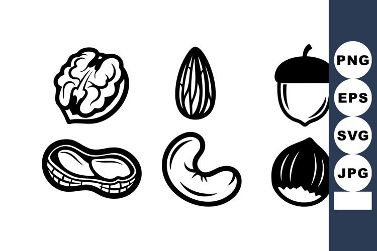Vector icons show six different nuts including walnut, almond, acorn, peanut, cashew, and hazelnut in black and white style. Simple and clear design, versatile and clean. Minimalist mood.