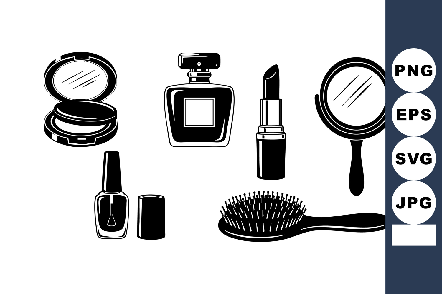 This vector illustration shows essential makeup tools and cosmetics such as lipstick nail polish perfume brush and mirror in black and white style creating a clean elegant look. Stylish.
