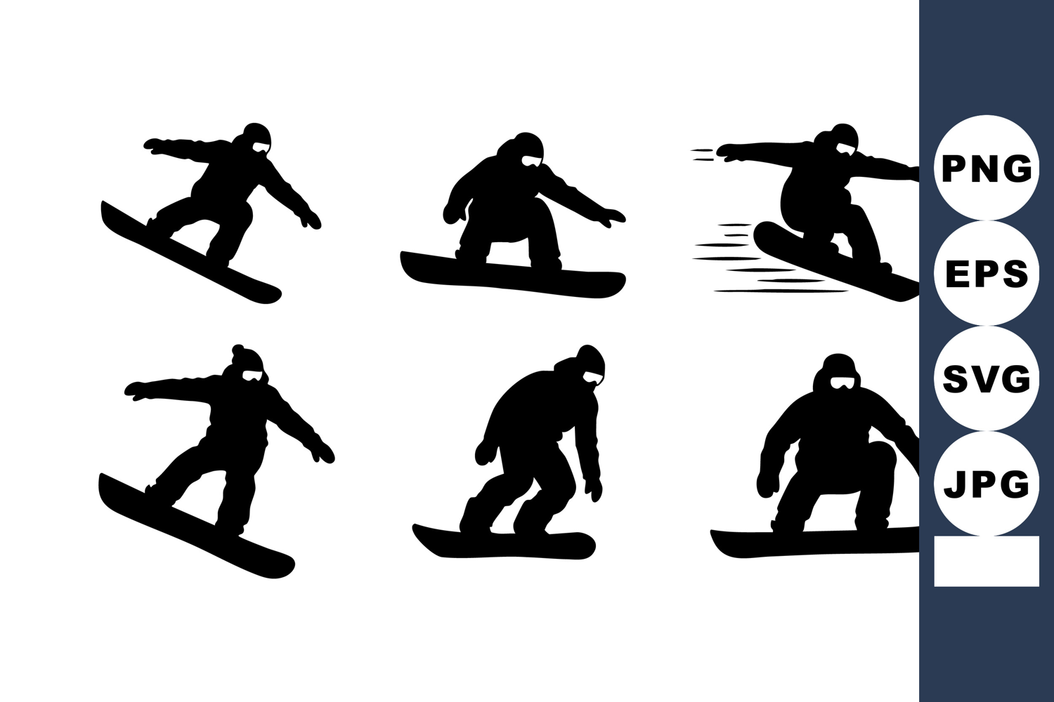 This vector file shows six black snowboarder silhouettes executing diverse stances and movements, capturing the essence of winter sports in a dynamic and energetic style. Exciting mood.