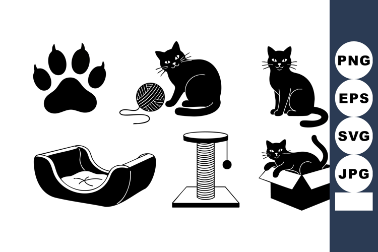 Vector features black cat silhouettes with playful poses, paw print, ball of yarn, scratching post, pet bed, and cardboard box in minimalist style. Playful mood.