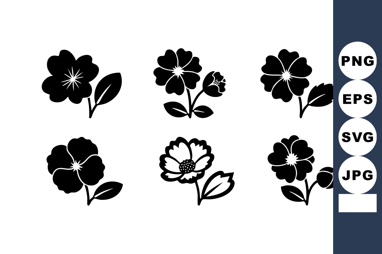 This vector file displays six black silhouette flower designs with various petal shapes and leaves, perfect for creative decoration, crafting, and design projects. Simple and elegant style. Calm.