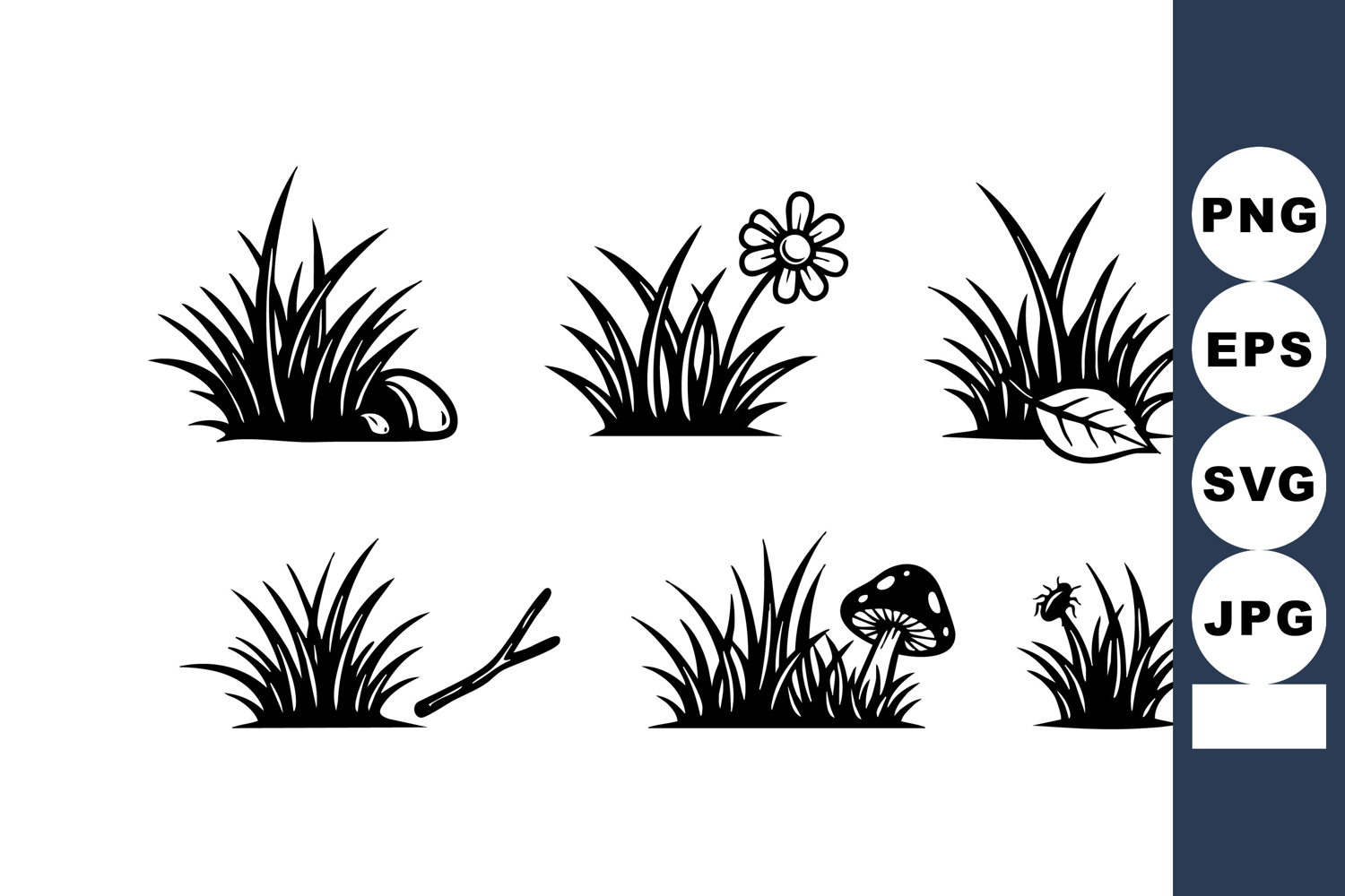 This vector features six black silhouettes of grass clusters with various natural elements including flowers, leaves, mushrooms, stones, and twigs. Minimalist and organic style. Calm.