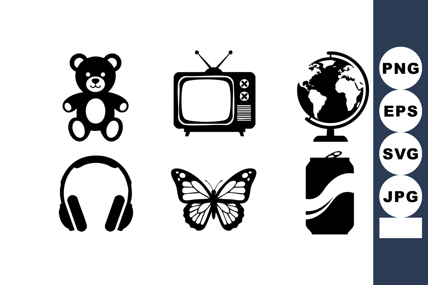 This vector features black silhouette icons of a toy bear, vintage television, globe, headphones, butterfly, and beverage can, representing various objects and hobbies in a clean style. Simple and clear.
