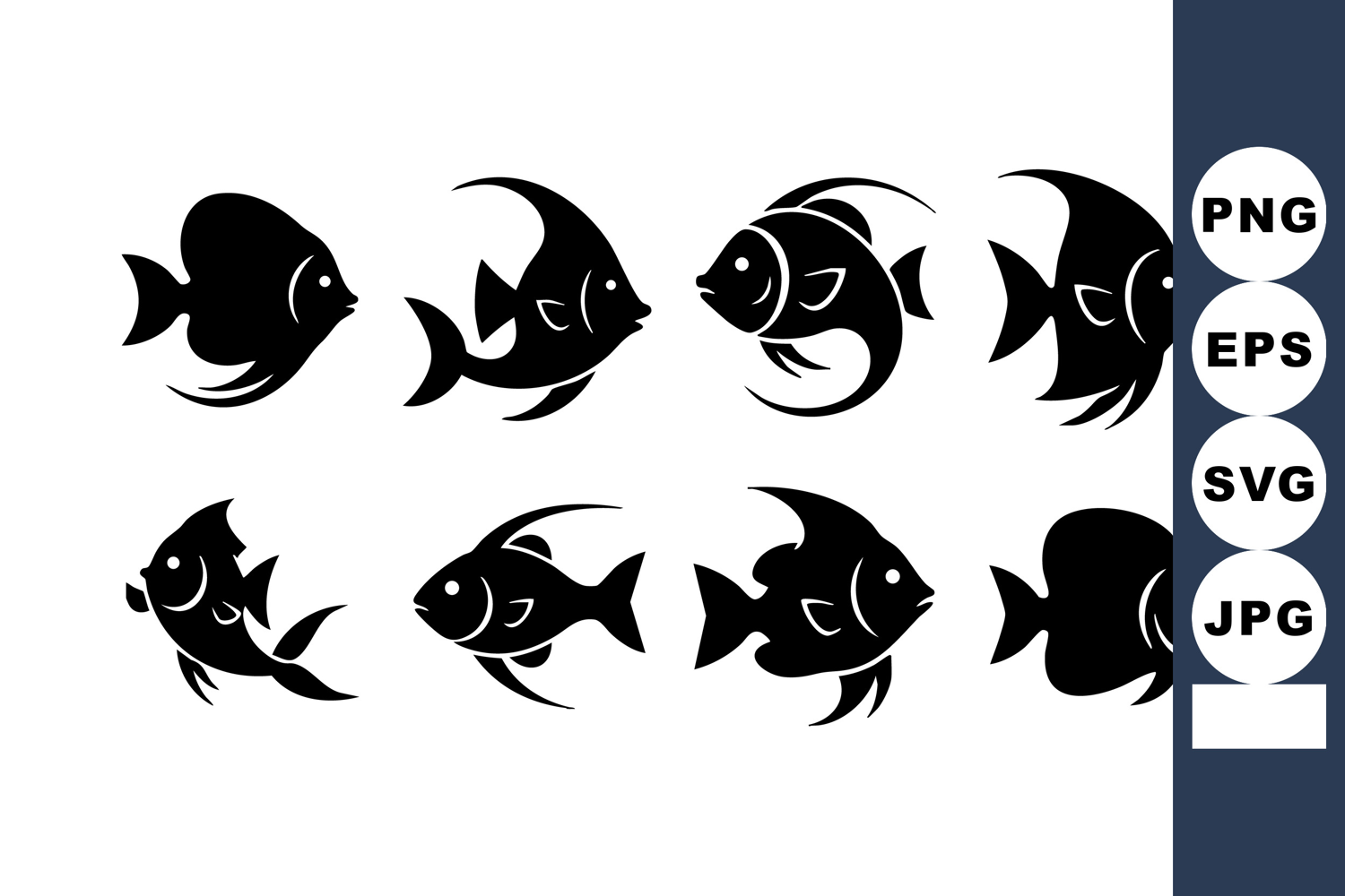 Image presents black silhouette tropical fish in different shapes and fin styles on white background. Simple design highlights aquatic theme with clean contrast, appearing minimal and bold. Calm mood.
