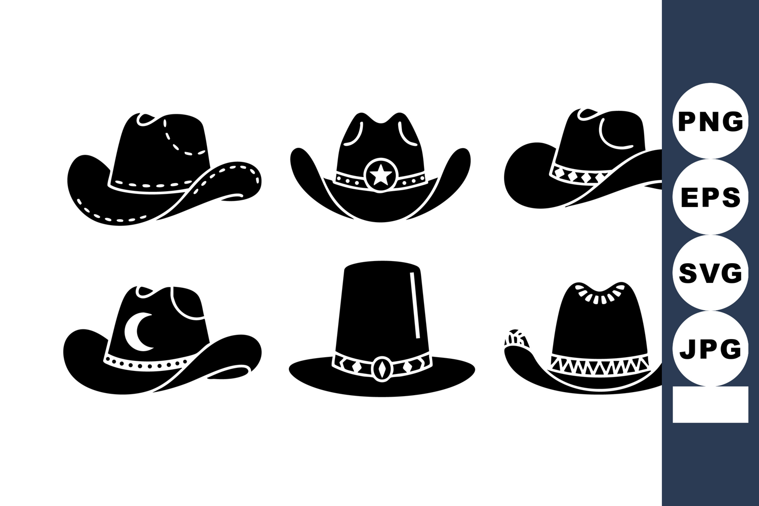 This vector image displays six black cowboy hats with unique decorative patterns and shapes arranged in two rows, showcasing western style and culture. Stylish and bold.
