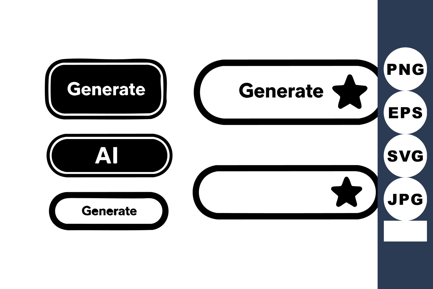 Vector of generate button icons featuring AI text and star symbol in black and white, designed for user interface and digital applications, clear and minimalist style, modern mood.